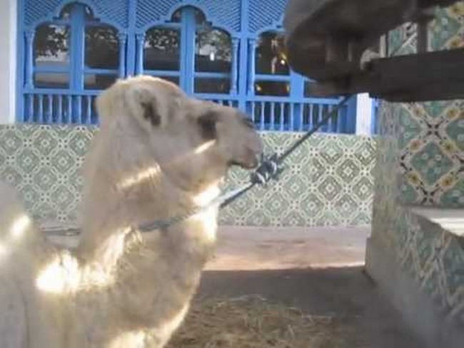 Ogni giorno Fathia lascia i piccoli prati che costeggiano la spiaggia di Marsa, a nord di Tunisi, e tranquilla e quasi altezzosa raggiunge il suo posto di lavoro: un antico pozzo d’acqua che sta nel mezzo di uno dei più famosi bar della zona, il SafSaf. Alì la lega alla ruota di legno e lei, se necessario, gira attorno e recupera l’acqua.