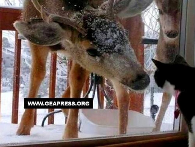 Il giovane cervo e il gatto. Il selvatico, stremato da un inverno che ha coperto le montagne venete con metri e metri di neve, e il domestico che sembra stare piuttosto bene al riparo della sua casa.