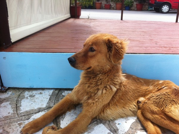 Mi hanno raccontato che si chiama Geremia e ha 6 anni. E’ il cane di Vathi. Tutti lo conoscono, lo amano, lo nutrono, lo proteggono.