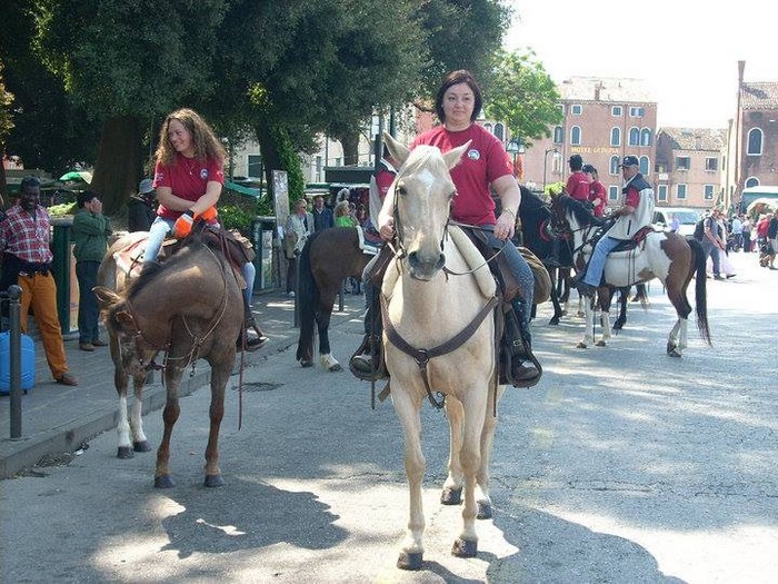 E tornare indietro, convinta dai vigili urbani che a Venezia a cavallo non si può circolare. Un tempo lo si faceva, molti secoli fa, ora proprio no.