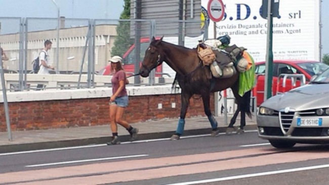 Obiettivo della giovane: immortalare il suo arrivo a Venezia. Una perla nel suo viaggio in compagnia dell’amico equino.