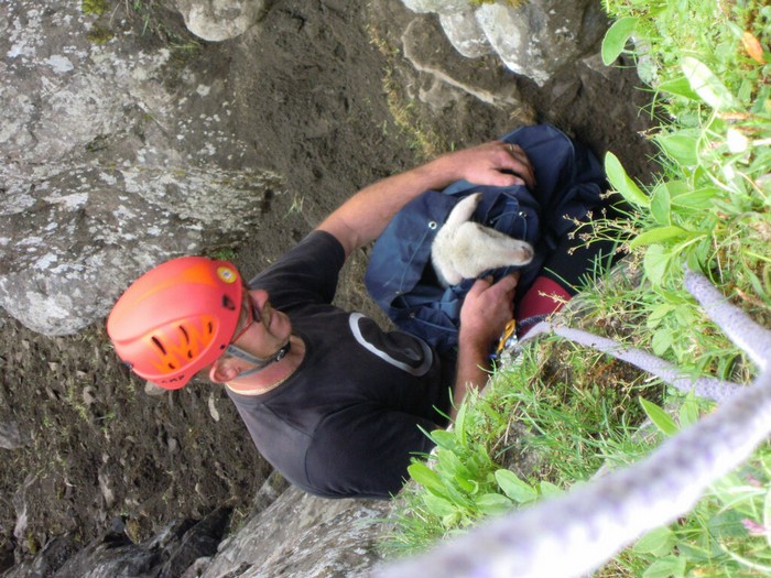 Uno dei soccorritori si è quindi calato lentamente sulla verticale per non impaurire la bestiola, scivolata con molta probabilità già qualche giorno prima al passaggio del gregge e che la madre non aveva abbandonato al suo destino.