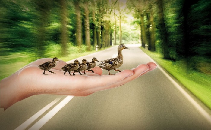 Un germano che attraversa la strada coi suoi quattro pulcini al seguito, accompagnati da una mano che li guida in sicurezza sull’altro lato.