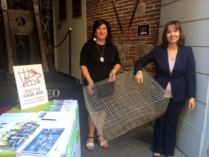 Annamaria Pisapia, direttrice di CIWF (Compassion in World Farming Italia) Onlus ha consegnato questa mattina alla direttrice del Museo della Tortura di Lucca, Maria Rosaria Aloi, una gabbia per conigli, a testimoniare quanto questo strumento di tortura, ancora legale e massicciamente usato negli allevamenti nel nostro paese, rappresenti una forma inaccettabile di maltrattamento verso gli animali quali esseri senzienti e debba entrare a far parte dei cimeli di un passato buio come quelli conservati al Museo della Tortura.