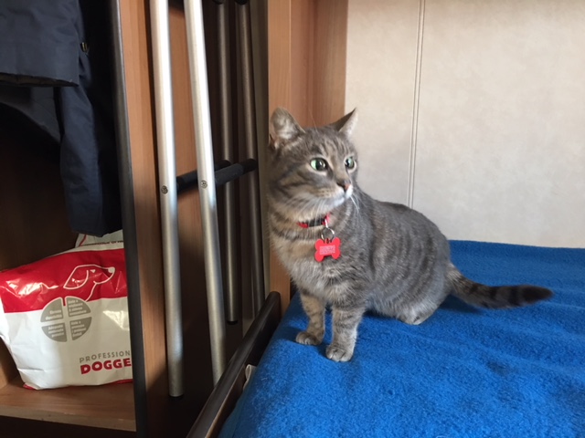 La stanza che si chiama cabina era piccola: due lettini, un bagno e una specie di armadio. Macri ha liberato le gatte. Olga e Kiki prima si sono rifugiate sotto la cuccetta, poi hanno cominciato ad esplorare la cabina. E mi hanno fatto le feste!